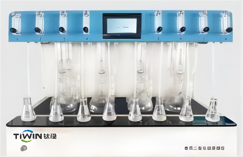 1. 自带气密性检测功能,可监测玻璃件连接密封性情况; 2. 采用远红外圆底陶瓷加热炉,功率可自动转换; 3. 蒸馏结束自动断电报警,方便操作; 4. 主机设有滴定蝴蝶夹,方便固定滴定管进行滴定; 5. 7寸液晶触摸屏设计,屏幕直观页面控制; 6. 自动加酸功能,可一键启动全程实验步骤; 7. 设有出气管放置座,防止出气管路凌乱,方便拿取。